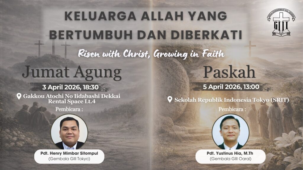 Sebagai puncak dari masa prapaskah 2026 ini, mari kita memperingati kematian dan kebangkitan Tuhan kita, Yesus kristus, dalam ibadah Jumat Agung & Paskah 2026 GIII Tokyo, dengan tema: